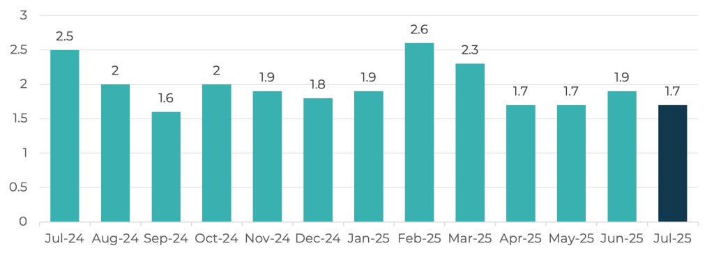 Canada’s inflation rate dipped slightly in July, with the Consumer Price Index (CPI) falling from 1.9% to 1.7%. However, “core” inflation—which excludes more volatile items like food and energy—stayed higher at around 2.5%, above the Bank of Canada’s 2% target.[4]