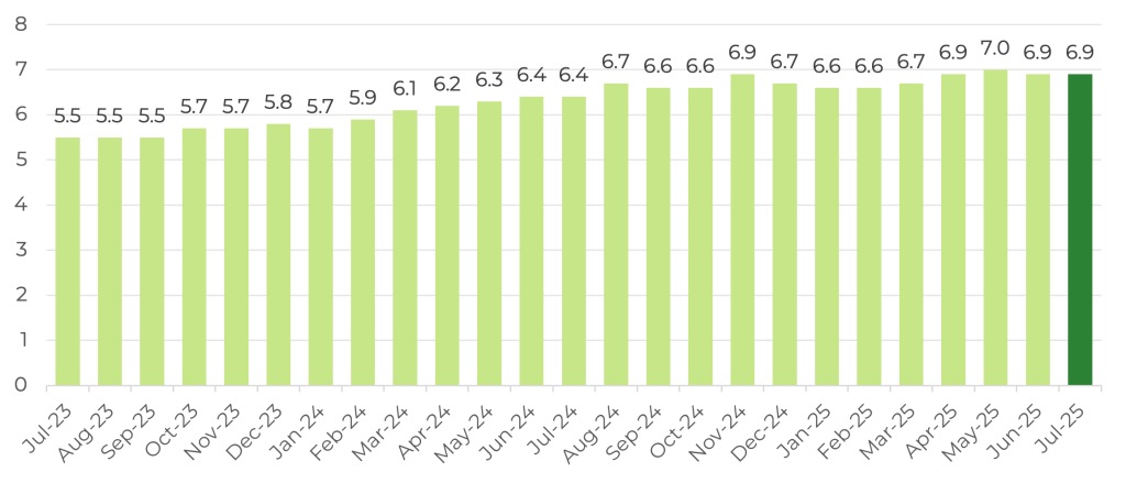 Figure 2: Unemployment Rate (Seasonally Adjusted) in Canada (%), July 2024-July 2025[7]