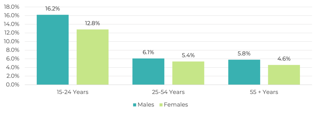 Figure 3: Unemployment Rate (%) by Age Group and Gender (Canada), July 2025 (Seasonally Adjusted)[9], [10]