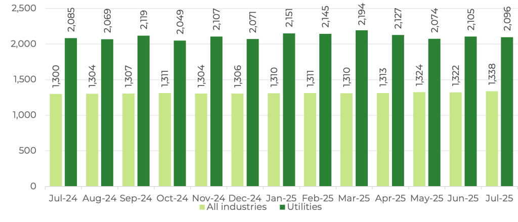 When it comes to wages, the average weekly earnings in the utilities sector were $2,096 in July, a 0.4% decrease from June ($2,105) and a 0.5% decline from a year ago ($2,085). For comparison, the average weekly wage across the economy was $1,338, which has remained fairly steady from both June ($1,322) and July 2024 ($1,300).