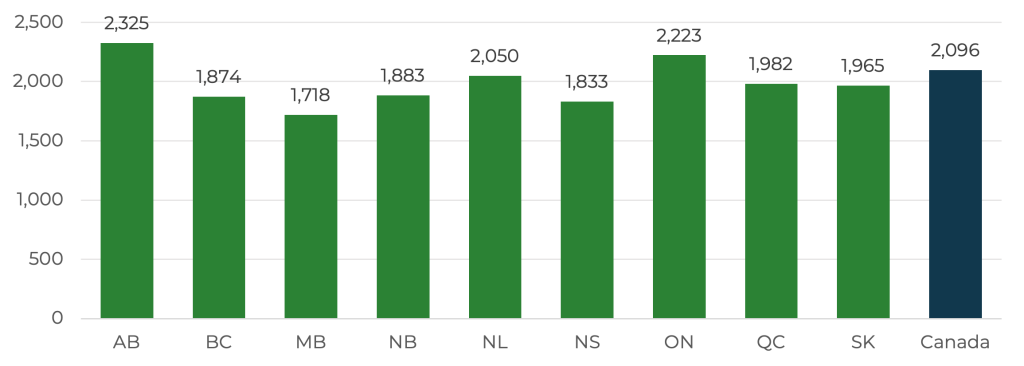 - Highest: Alberta at $2,325 (10.9% above the national average