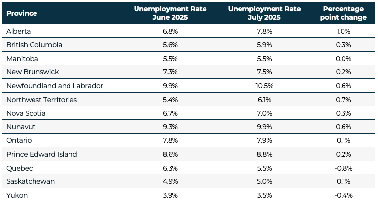 Table 1: Unemployment Rate by Province and Territory, June 2025 and July 2025 (Seasonally Adjusted)[8]