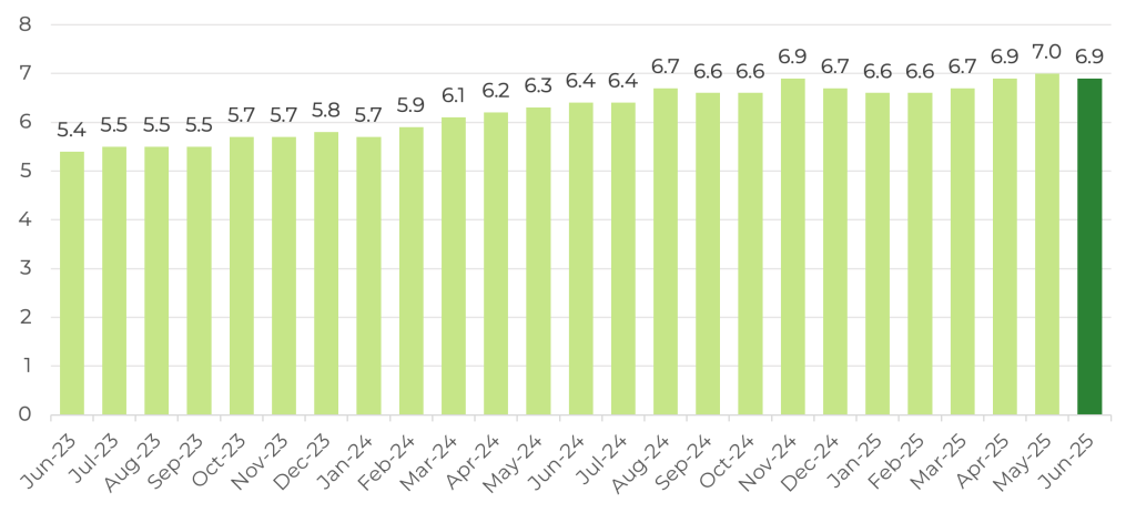 Figure 2: Unemployment Rate (Seasonally Adjusted) in Canada (%), June 2023-June 2025[7]