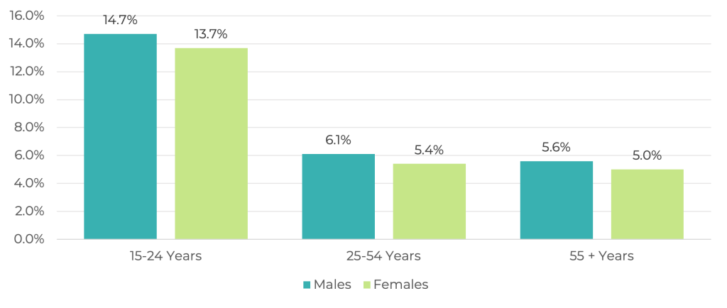 - Youth (15-24 years): 7% for men (down from 14.9%) and 13.7% for women (up from 13.4%)