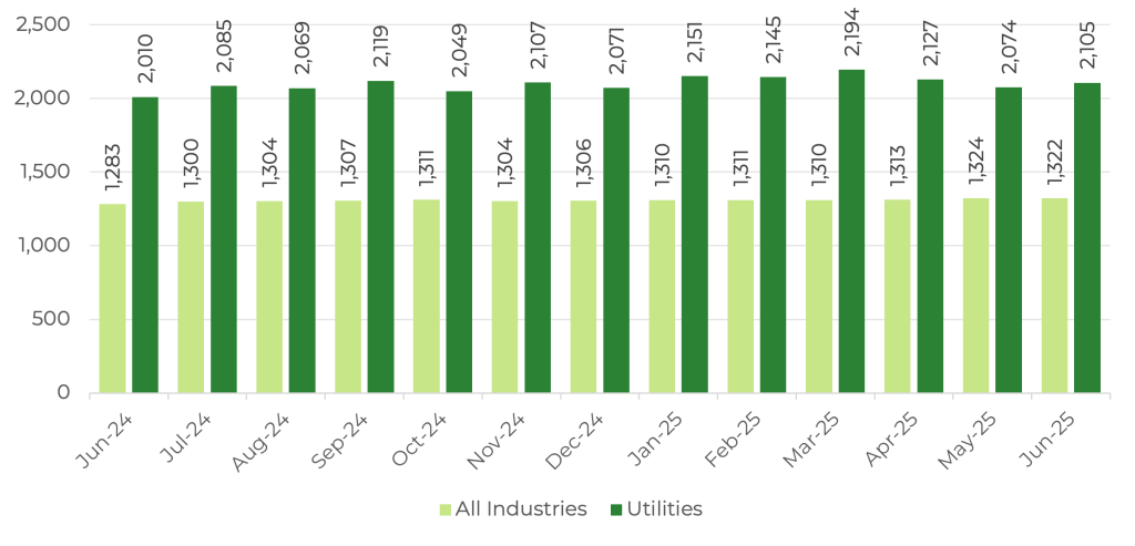 The average weekly earnings in the utilities sector were $2,105 in June 2025—a 1.5% increase from the previous month ($2,074), and a 4.8% increase relative to one year earlier ($2,010), as seen in Figure 4. Economy-wide average weekly wages in June ($1,322) were virtually unchanged from May ($1,313) but were 3% higher than in June 2024 ($1,283).