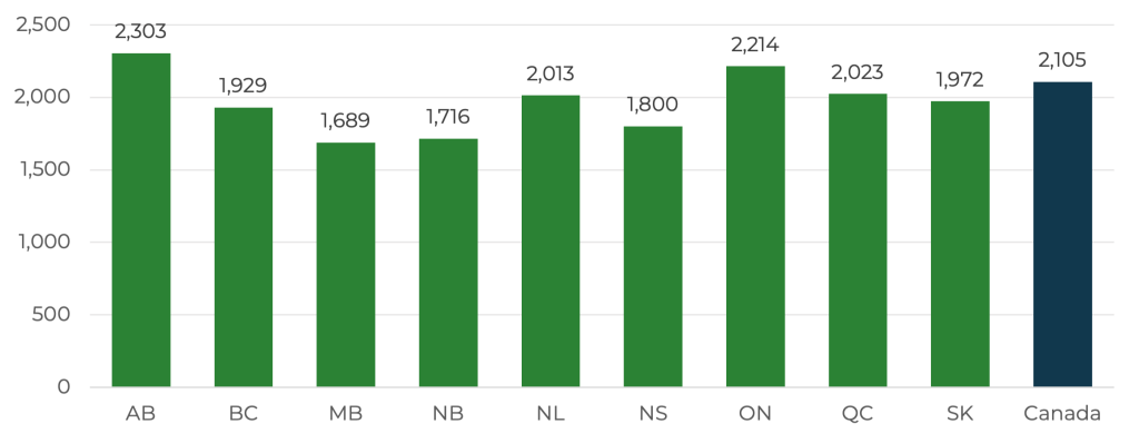Provincial wage averages in the utilities sector ranged from a high of $2,303 in Alberta to a low of $1,689 in Manitoba, 9.4% above and 20% less than the national average, respectively (Figure 5).