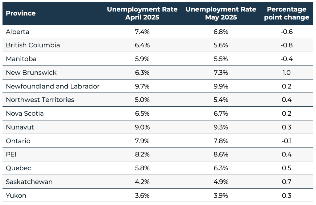 Table 1: Unemployment Rate by Province and Territory, May 2025 and June 2025 (Seasonally Adjusted)[8]